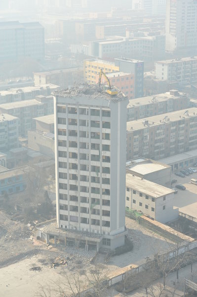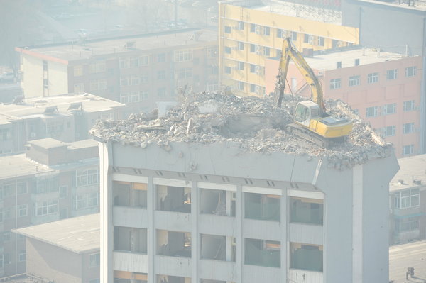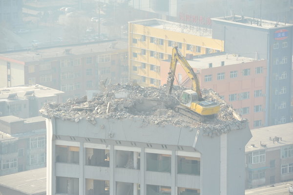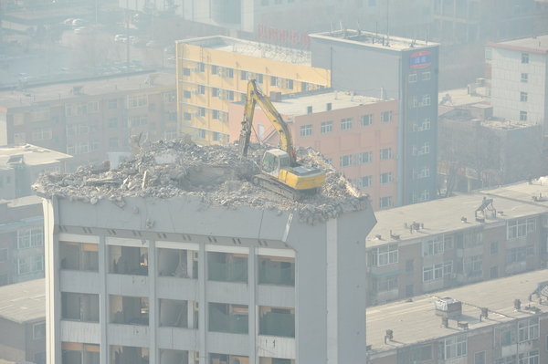 2012年1月5日,山西省太原市万柏林区迎泽西大街,山西科技大厦宾馆顶层,一台挖掘机在楼顶上作业。令周围市民既惊奇又担忧。
