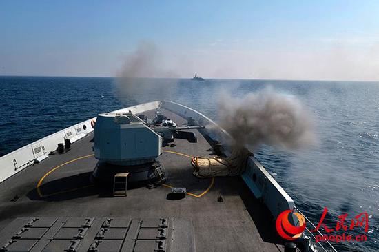 到达指定海域,双方立即组织了狭水道航行中应对称威胁、编队运动的演习。12时30分,中巴混合舰艇编队组成战斗队形,依次对漂浮靶进行主炮射击。“校对瞄点……瞄点正确,开火!”随着指挥员迟庆涛一声令下,数海里外腾起水柱烟雾,邯郸舰主炮直接命中目标,靶标瞬间被摧毁。海上实兵演习首日,打出满堂彩,官兵士气高昂。