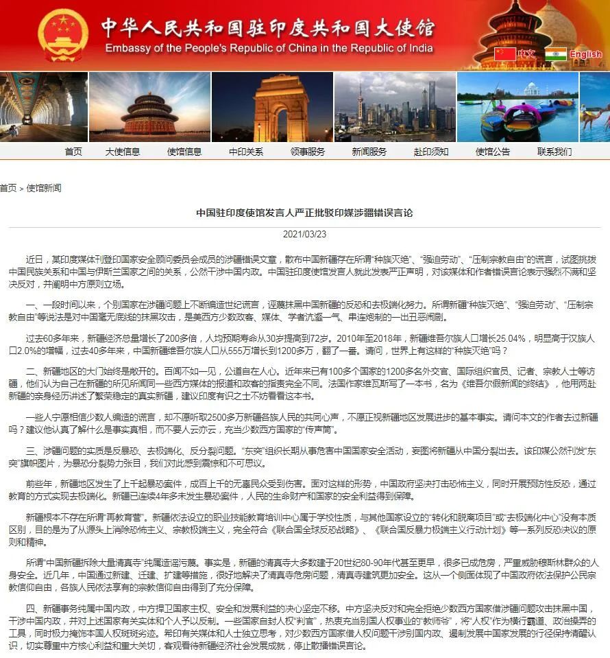 3月23日,中国驻印度使馆发言人严正批驳印媒涉疆错误言论,全文如下:
