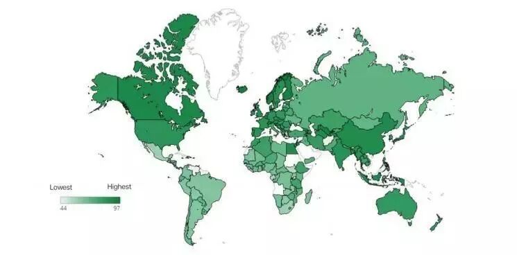 ▲盖普洛的报告,绿色越深,说明越安全,新加坡得分第一