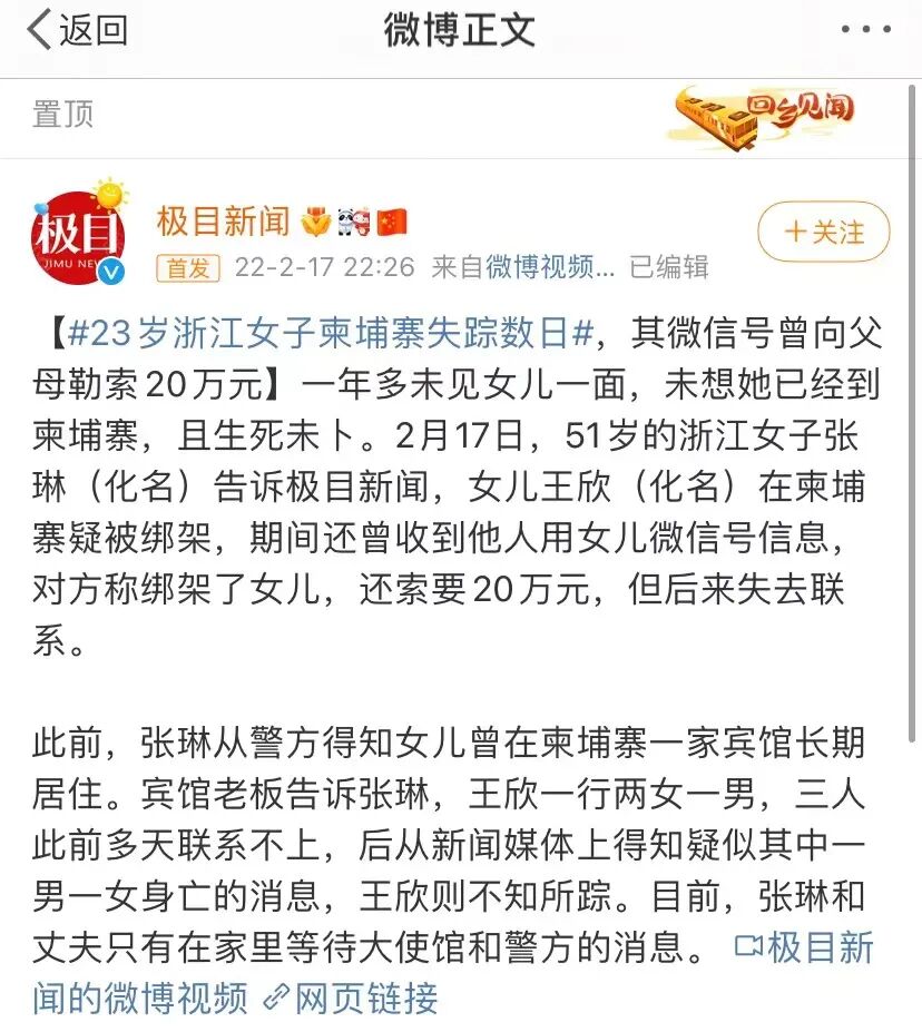 今天,又爆出了一条热搜,一位23岁的浙江在柬埔寨失踪数日,生死未卜。