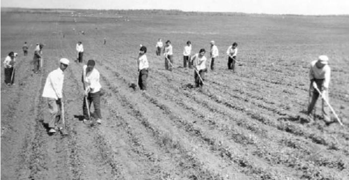 女知青在干活上和男知青一视同仁,她们干的第一件农活就是种地,两人一组。前面的人用锄头挖坑,后面的人往坑里撒种,然后用土把种子盖上。