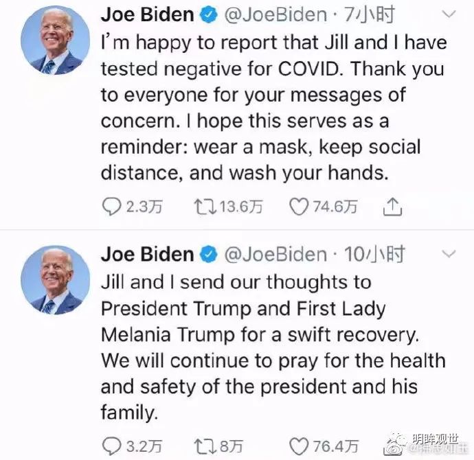 老川的竞争对手拜登和他的竞选搭档贺锦丽也各自携伴侣祝愿老川和第一夫人早日痊愈,他们会为总统及其家人的健康平安持续祈祷。