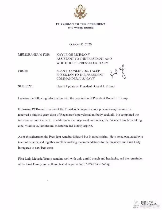 首先,最新发展是老川出现轻微发烧症状,已被送往沃尔特·里德国家JUN事医疗中心治疗。另外,作为一种预防性治疗措施,白宫医生已经给老川施用了再生元公司的最新实验性多克隆抗体鸡尾酒疗法,以增强老川自体对抗病毒的免疫力。在去海军一号的路上,老川没有像往常一样停下来跟记者打招呼或回答问题。不过,老川的推特发布了一个视频,视频中老川向支持他和第一夫人的人们表达了感谢,并表示他现在状态良好,但需要确保最终无恙。老川的白宫医生此前发表声明说,老川有点疲乏,但精神状态良好,第一夫人状态也不错,只不过有轻微咳嗽与头疼症状。而第一家庭其他成员新冠病毒检测结果皆为阴性。
