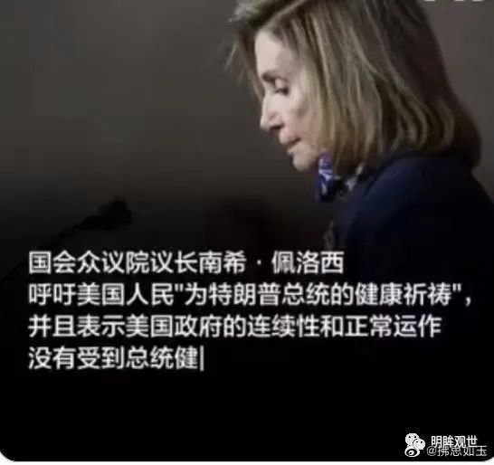 与此同时,总统职位第一顺位继承人副总统彭斯、第二顺位继承人众院议长佩罗西、民Z党总统候选人拜登与副总统候选人贺锦丽的新冠病毒检测结果也皆为阴性。此外,据悉白宫已经依据保证government持续运转的法定程序与众院议长佩罗西取得联系。在得悉老川感染新冠之后,副总统彭斯和共和党大佬们纷纷向老川和第一夫人送去了他们的祝福和祈祷,而老对头佩罗西也第一时间如此表态: