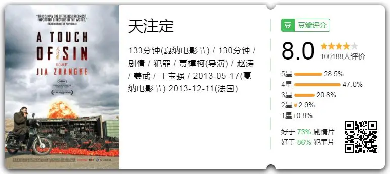 《天注定》是一部充斥着绝望情绪和戾气的电影。