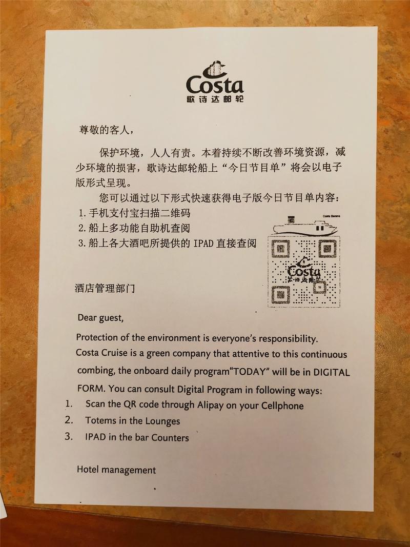 5、再上歌诗达,最明显的变化是非常熟悉的“Today”没了,原来都是每天送到房间的。那么要了解船上活动内容怎么办?一是通过链接歌诗达网,通过邮轮APP上查找所有信息(还可以在上面点餐),但这项操作适合年轻人,绝大多数游客玩不了。二是在每层的电梯厅有一张供查看的“Today”,可以拍下来,通过手机查看。三是听广播,遇到有大型活动都会提前播音。总之,取消了纸质“Today”船家可能节省了一笔费用,对乘客来说非常不方便。好在赛琳娜船不大,活动内容相对简单,大致熟悉船体状况后,走哪看哪吧。
