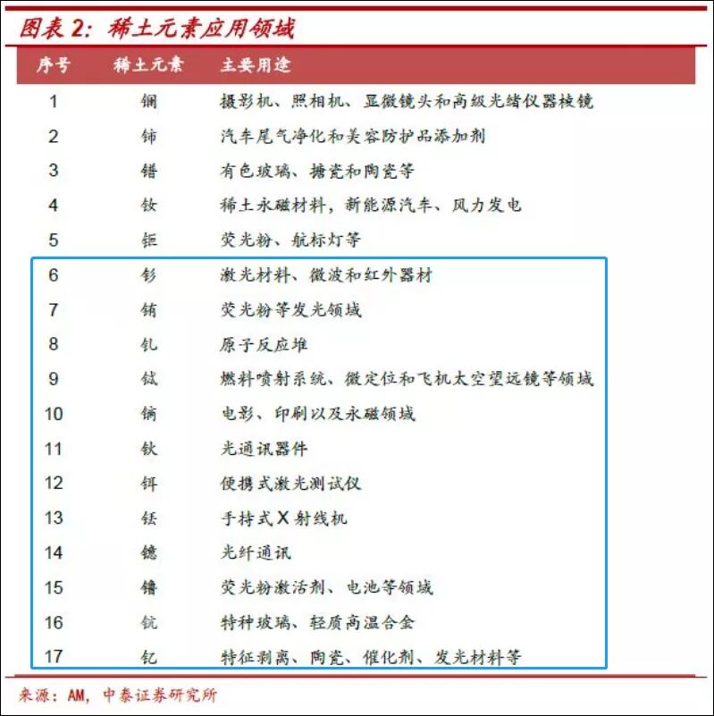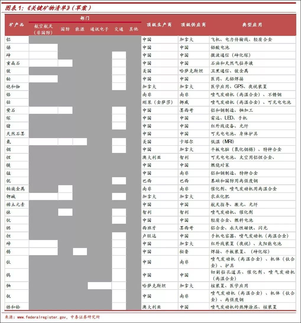 值得注意的是,相比之下,去年2000亿美元商品征税意见的征询时间跨度达71天,而这次只有42天。 中国独有中重稀土 稀土一直是中美贸易摩擦中无法被忽视的焦点。从资源禀赋上看,中国的稀土储量不仅占世界总储量的23%,而且还具有种类多、配分全的特点。 更令人激动的是,中泰证券去年4月发布研报称:“我国独有的离子型(以中重为主)稀土矿富含稀缺的中重稀土元素,是真正占据主导地位、具有绝对竞争优势的战略性资源。” (观察者网注:中重稀土包括钐、铕、钆、铽、镝、钬、铒、铥、镱、镥、钪、钇) 从应用上看,中泰证券强调:“稀土下游消费大多集中分布在新能源、新材料等战略性新兴领域,其潜在需求被长期看好,特别是稀土永磁材料在新能源汽车领域的消费具备较大增长潜力。” 而谈及新能源汽车,锂资源始终是一个绕不过去的话题。 值得一提的是,观察者网此前报道,美国政府官员计划于5月与美国汽车制造商和锂矿商高管们会面,并将首次推出全国性电动汽车供应链战略。 在这条消息的背后,是中国生产的锂离子电池占全球的近三分之二,而美国仅占5%。 另一方面,锂也于去年被美国内政部列为35种关键矿物之一。 去年2月16日,美国内政部发布《关键矿物清单》(草案)(下称:《清单》),涉及到美国对外依存度高,且对美经济发展和国家安全至关重要的35种金属矿产。 尽管在《清单》中,锂资源的顶级生产商、顶级供应商分别为澳大利亚、智利,但不容忽视的是,其中19种矿物的顶级生产商为中国,占比超过50%;13种矿物的顶级供应商为中国,占比也达到了37%。 这其中,稀土元素被归为单一大类,中国同时扮演着顶级生产商、顶级供应商两种角色。 顶级生产商为中国:铝、锑、砷、重晶石、铋、萤石、镓、锗、天然石墨、铟、镁、锰、稀土元素、钪、碲、锡、钛、钨、钒。 路透社报道指,如今,上述35种矿物中的大多数都要承受美国对华商品征收的关税,但稀土、锑(用于电池和阻燃剂)、氦、天然石墨等仍不受关税限制。 另外,用于科研的铯、铷均不在美国本土开采,而用于制造汽油、钢铁和铀燃料的萤石也没有被影响。