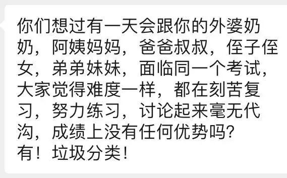 还有人说,垃圾分类是一场同一起跑线上的考试,上到80岁的老人,下到幼儿园小朋友都能参与。