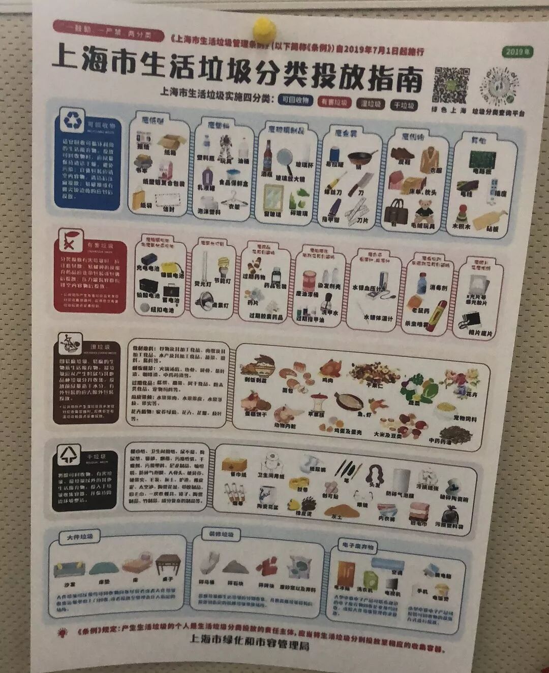 哪怕还搞不清楚怎么分,做做准备工作总是没错的:官方分类图贴起来、屏保用起来,4只垃圾桶先摆好,囤点颜色不一样的垃圾袋……
