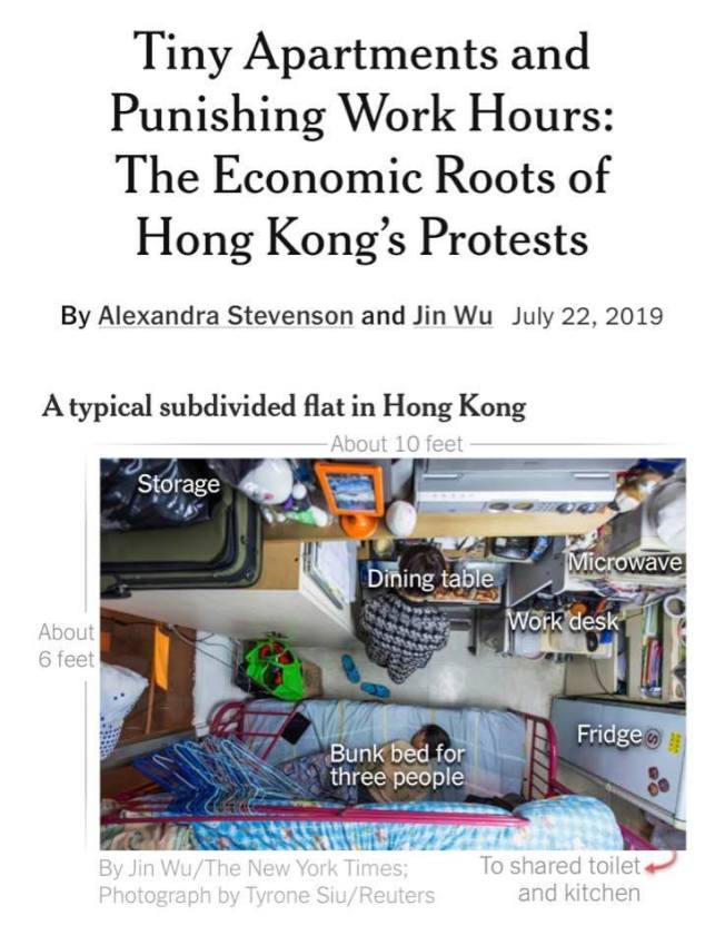 在香港,租紐約、倫敦、舊金山公寓一半大小的房間,付的租金卻更高。香港每五個人幾乎就有一個人生活在貧窮線下。最低薪資每小時4.82美元。