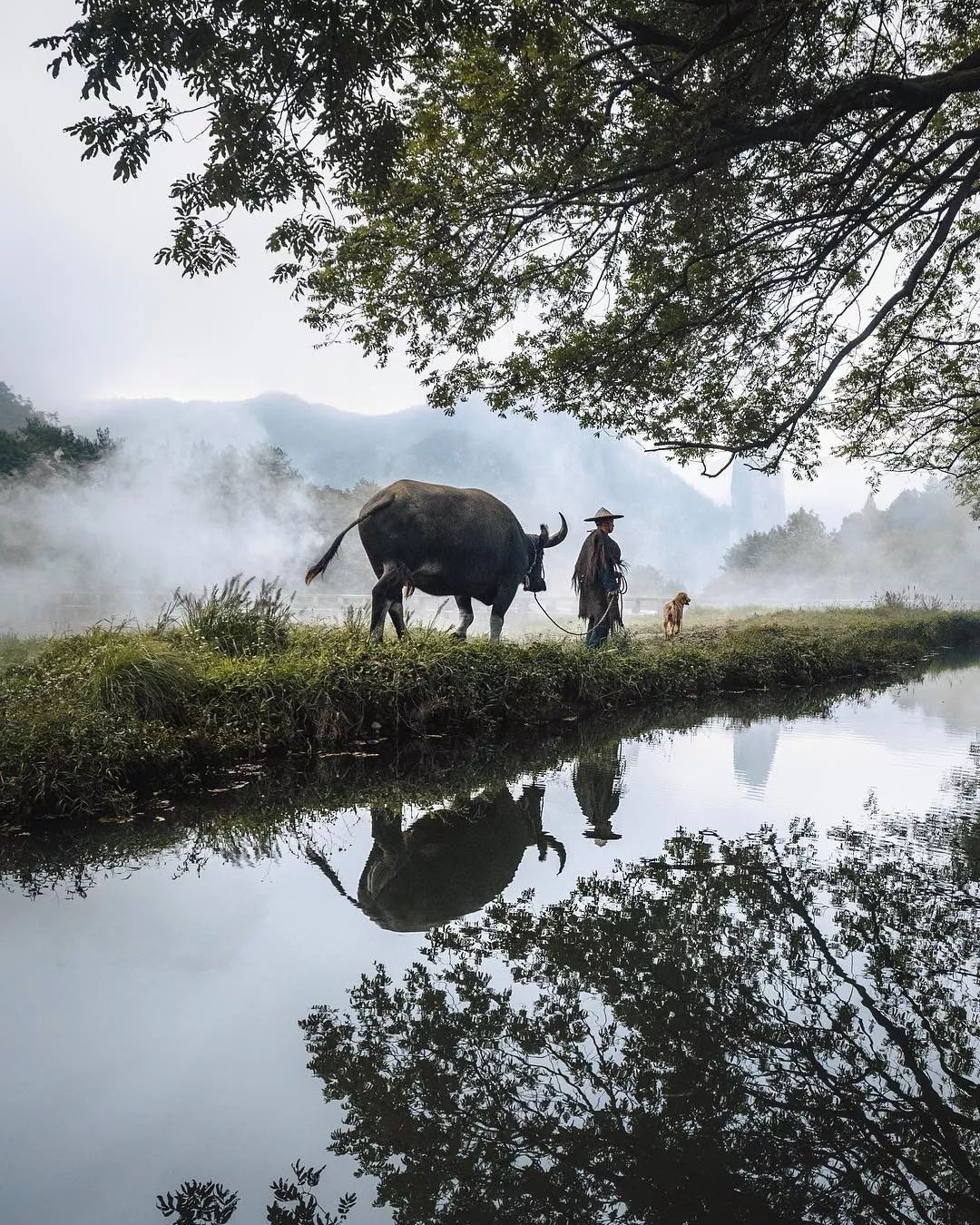 浙江仙都,一人一牛一犬, 云雾缭绕,桃源深处有人家。