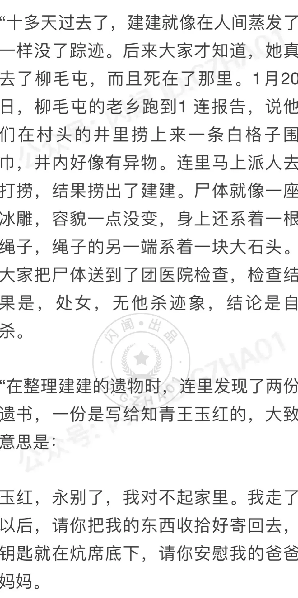 “建建给我写的那封信,被同屋知青发现后交给了领导。当时连队禁止知青谈恋爱,那封情书一曝光,立刻成了重大违纪事件。但是没有人把这件事透露给我。建建失踪后,我还和大家一起找过她。直到把她的尸体从井里捞上来时,我才知道了这件事和我有关。