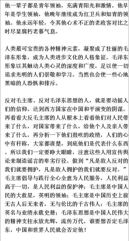 谁要是妄想否定毛主席,中国人民就会否定他。毛主席已经不再是某个人的个体,毛主席已经成为中国社会民众的集体共同意识,一个巨大的精神符号,一个崇高的文化图腾,凝聚着无数人的意志,表达着普通民众自身不能实现或不敢实现的心灵渴望。 毛主席是救世救民的悲悯 他不是为自己活着,他看到众生痛苦、人心愚昧、社会黑暗、文化沉沦,他就主动站出来,作领头人,带领大家去作除旧布新的工作,建立一个新世界。 毛主席是弱者翻身解放的渴望。恃强凌弱的世界里,有多少人愿意走向社会的最底层?有多少人愿意把手伸向那些在绝望中挣扎的人群? 毛主席真正明白那些底层里的、那些在绝望中挣扎的人也是人,也是自己的同胞,也有生存的权利和生命的尊严,他向他们伸出了有力的大手。他是真正的人道主义者。 毛主席是生命的价值和意义 仅仅解放了弱者的肉体,那还不是真正的解放。他教导弱者应该自尊自强,作社会人生的主人公。他也解放强者,让强者明白生活的意义不是压迫剥削。他教导人们应该怎样建立合理的思想观念和生活世界。他是人类的精神导师。 毛主席是公平正义 一些人总想成为人上人,但另一些人总想着帮助别人;一些人要把别人践踏在脚下他才活得舒服,但另一些人看到别人受苦他就难受。毛主席看不得社会上有人压榨别人,更容不得人吃人。 毛主席是无私无我 毛主席不是一个封闭的自我,不是一个自私的个体。 毛主席是人民大众的共同命运,他的生命与人民大众的生命是连在一起的。他走后,没有给儿女留下地位和财富,也没有从私情出发给他们留下权力保护。他的确已没有私心和特权观念,完全把自己和家庭看作是社会大家庭的平等一员了。 毛主席是智慧和力量 他一生的政治、军事、经济、文化韬略,展现出极高的思想境界,深含极妙的艺术灵奥,产生出震烁古今的强大力量,成为无数人苦心参悟的哲学。 毛主席是大无畏和奋斗。他一辈子不知道什么是害怕,从未把敌人放在眼里。他认准了真理,认定了目标,就会全力以赴,排除千难万险去争取胜利。 毛主席是牺牲和坚强 他的家庭,为人民解放事业牺牲了好几位亲人。他的晚年,为了继续革命事业,甚至不惜让自己粉身碎骨。 毛主席是质朴和耐心 他对人民的感情是极其自然的,他与群众没有距离,他做群众的思想工作极富耐心,是真正的人民教师。 毛主席是谦虚和谨慎 他认为人民群众是聪明的,他在作人民教师的同时也作人民群众的小学生。他的事业极其辉煌,但他认为万里长征只是走出了第一步。 毛主席是真诚和忠诚 他有着赤子般的率真坦诚,不掩盖自己的观点和情感。他忠诚于人民,忠诚于信仰,忠诚于集体事业。他的真诚和忠诚,让一切在他面前玩弄权术阴谋的政客显得黯然失色,猥琐不堪。 毛主席是傲骨、正直、大气 作为领袖,他不能忍受高高在上,也从不媚俗,从不作秀,从不自欺欺人。他能够调动最大多数人的积极性,诚恳地团结人民群众为共同的目标而奋斗。他是非分明而有富于人情味,踏实细致而气吞山河。他的领袖风格,既平易近人,又恢宏大度。 毛主席是勤奋好学 他一辈子,活到老,学到老,暇不掩卷,孜孜不倦,求学进知,活学活用。他是学问大师,使那些不学无术的政客相形见绌。 毛主席是多情与浪漫 他为人间正义事业的胜利而泪飞顿作倾盆雨,他在战火纷飞时、在征途中的马背上吟诗。他的心灵那么敏感,山水自然和人群社会时常触动他的情思。他的内心世界如此丰富多彩,教那些不自量力贬低他的精神高度的庸俗政客尽显自心的狭隘肤浅。 毛主席是理想与理性 他是诗人,也是哲学家。他的理想高远,他的理性异常超拔。漫长的中国革命和中国建设,他以他的理想在前面引导,同时以他的理性不断地调整前进的方法和步骤,带领革命队伍和人民群众奋勇向前。 |