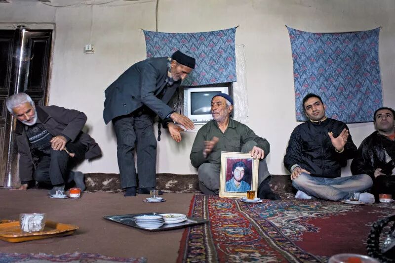 贝赫沙赫尔山上的雅赫凯什村艾木让(中)家,相框里的年轻人是他的儿子默罕默德·瑞赞,18 岁时死于两伊战争。
