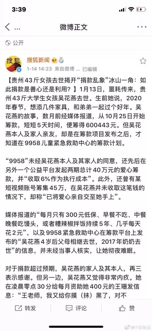 后续更新:【9958:贵州43斤女大学生获捐百万仅收两万是因乡政府干预 乡政府否认】1月13日,贵州43斤贫困女大学生吴花燕去世。