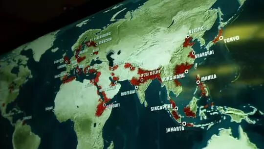 由格温妮丝.帕特罗饰演的女食客Beth,先是在澳门赌场这种高人口密度的封闭型空间内,感染了多位国际人士。首当其冲地,她将病毒传染给了和自己在赌场一起玩耍的日本男同事。然后,这位日本同事乘坐回程国际航班时,已感不适,又将病毒传染给了空乘,回到日本后,他没意识到问题严重性,乘坐公交出行,结果在车上暴毙,成为日本的“0号传染源”。