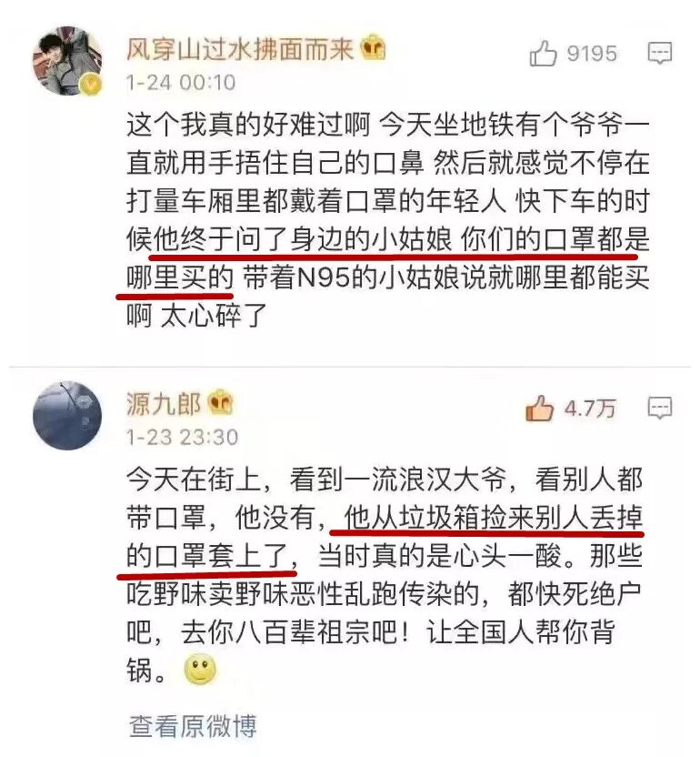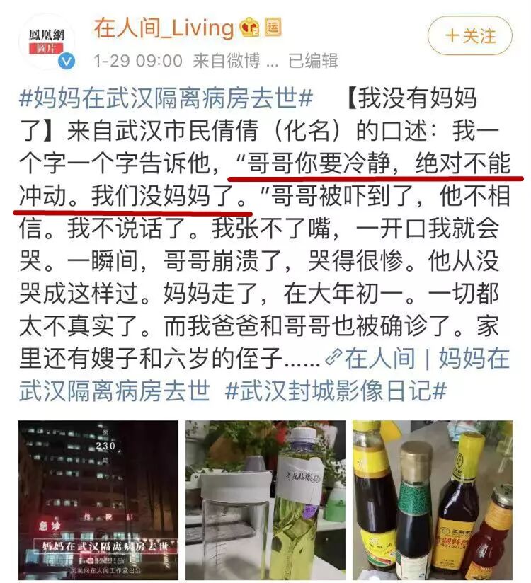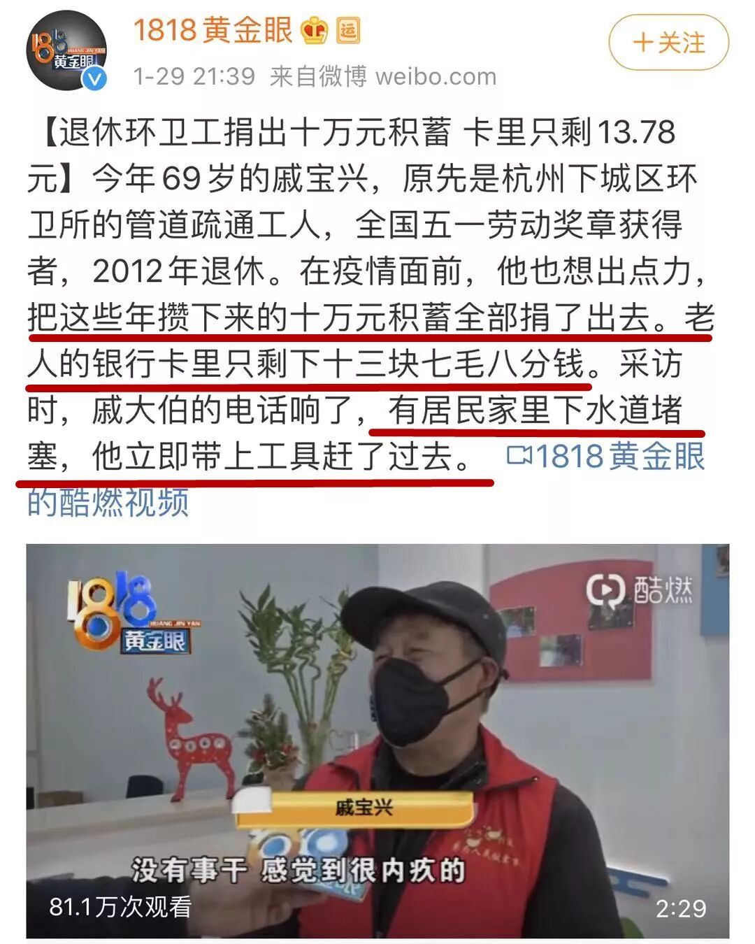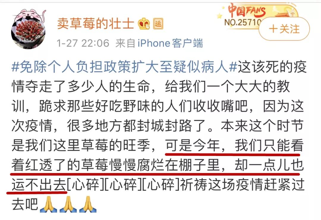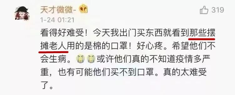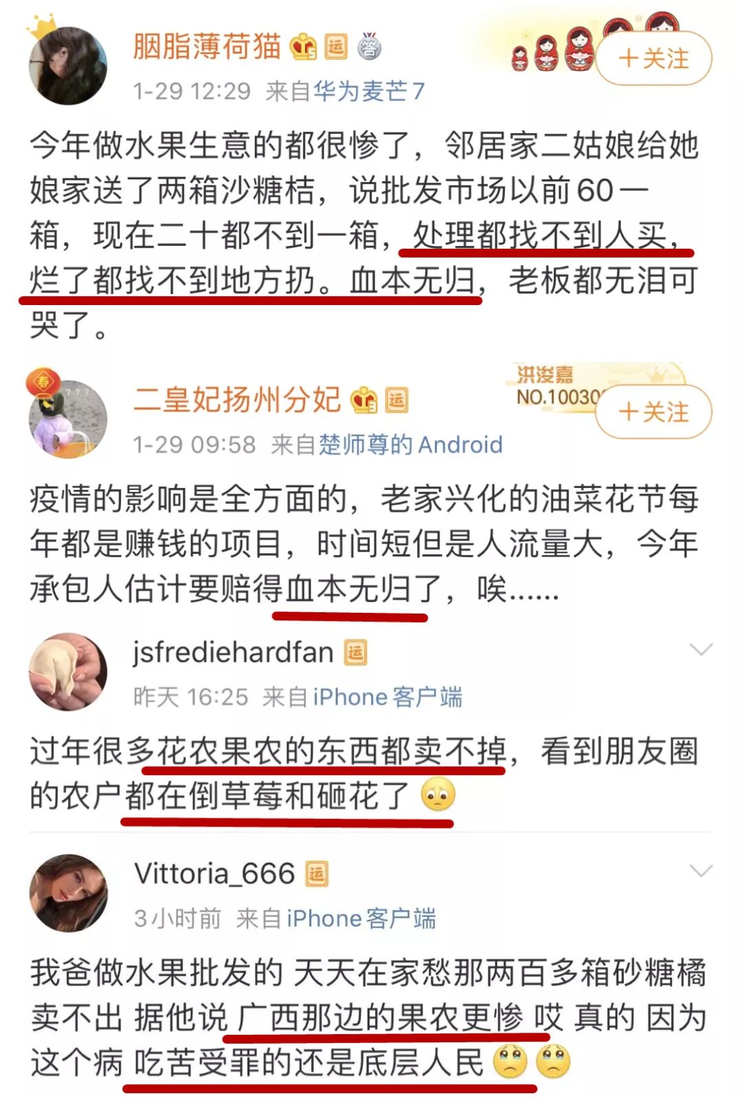 凤凰东方传媒 那篇文章来自武汉一个叫倩倩的女孩的口述,在农历新年第一天,倩倩的妈妈在隔离病房里去世,而她的爸爸、哥哥也先后感染。很多人看了这篇文章都忍不住流眼泪,因为那种无能为力和失去至亲的感觉真的太痛了,我们也从未如此真实的意识到人类的脆弱...随着疫情的扩散与加重,这几天微博上各式各样的求助帖越来越多,很多人的亲人都被感染,甚至病危。我们知道在武汉、在湖北、乃至全国各地,有人一夜之间失去了骨肉至亲。我们也知道很多医务工作者正在不分昼夜的轮番工作、披星戴月战斗在一线,与病毒作斗争。可是实际上,这场因病毒引起的瘟疫所带来的不良影响,却不仅仅如此对于很多年轻人来说,包括我身边的一些朋友都只是感觉到疫情很严重,所以我们的假期延长了。可是,疫情的影响是全方位的,我们忽略了一些与我们切身相关的东西。是的,在这场瘟疫中有人失去了父母,而同时也有很多人因此倾家荡产、食不果腹,开始为一日三餐发愁。今年冬天对于养殖业的农民来说,是一个切切实实的寒冬以养鸡为例,由于疫情的扩散,饲料厂无法开工,很多小鸡都没有饲料喂而很多人因为怕感染病毒,见活禽色变,所以也不会买鸡除此之外大部分屠宰场、活禽市场都关闭了,导致成品活禽根本卖不出去、无处可销很多农民血本无归、走投无路之下,只能眼睁睁的看着那些辛辛苦苦养大的鸡饿死,或者把它们都埋了...广东地区每年春节期间都会举办花市,传统花市在个别地方花市会开放10几天,每天开放至凌晨2点,但今年受肺炎疫情影响,广东地区的花市提前结束了因为花市闭市,运回家又要花钱,很多花农只能把花都砸了不仅花农,还有不少果农也遇到了类似的情况,他们都只能把辛苦培育的作物亲手毁掉在这类信息下,很多人都在问“与其毁掉,免费送给大家不好吗?”如果把东西运走,那就是在本来就亏本的情况下又亏一笔运费如果贱卖或免费送人,那就会扰乱市场价格,别人的生意、明年的生意都没法做了由于封城与封路,许多农民们一年来的辛勤耕耘与投资都付之东流,血汗钱一分都赚不到,甚至还可能要赔钱...而除了农民与劳动者,那些本本分分过日子的底层老百姓,他们的处境也很让人心酸昨天,我在微博上看到这个老爷爷的图片与视频,这是在河北地区的一个农村,老爷爷戴着口罩卖一块钱一根的糖葫芦河北每一个村子基本都封了,街上也没有人,这个老爷爷几乎一根糖葫芦都没卖出去视频里监督员为了村民和老爷爷的不受感染一直在催促他离开,语气也特别严厉这个老爷爷一句话也不敢说,只把糖葫芦一个个摘下来放到箱子里,骑着小车走了还有很多像这个老爷爷一样的小摊小饭,他们在年前进了不少货物,例如几百斤鸡蛋、几百根彩绳...就等着春节期间趁着人流量大的时候,在集市上卖出去,好在年底赚个辛苦钱,可是一切都毁了对于大部分底层人民与劳动者来说,春节其实是他们最有希望挣到钱的时候,可是天灾人祸毁掉了他们的希望由于信息闭塞或知识落后,他们有的根本都不知道发生了什么,这就是亿万谋生活的老百姓的缩影!他们也没想大富大贵,只想老实本分过日子却也这么难,真的太让人难受了“那些在武汉等公交车的农民工们不知道,公交车再也不会来,他们也回不去了”对于很大一部分像农民工一类的底层劳动力,他们靠卖苦力生活,有的年纪很大,也没有手机,不清楚疫情到底发展到何种情况他们可能会幸运地躲过病毒,可是没人知道他们能否躲过疫情导致的连锁效应带来的伤害“所以受委屈最大的,其实是知乎上没什么声音的工人。你跟他们讲隔离讲防疫,但你没法帮他们交房租水电、一日三餐。” 这次疫情的出现,突然让我意识到,个体的悲欢苦难在天灾人祸前真的太渺小了,太渺小了可是即便这样,我们还是会看到一些哪怕身陷泥泞、却仍然忧心天下的人1月27日,浙江湖州一位83岁的拾荒老人林大爷来到社区,匿名捐赠了1万元林大爷的善举被媒体报道后,很多人都非常感动,之后湖州当地有一位网友牵头,号召爱心人士们众筹了一万元,送到了林大爷家可没想到,林大爷又把这一万元送到了社区打算再次捐出社区了解老人的家庭情况,林大爷的老伴今年84岁,瘫痪在床,林大爷平时除了拾荒,还要照顾老伴,家境并不富裕,所以社区没有接受这笔款项随后,林大爷又去了银行,把那一万块钱汇到了湖州市吴兴区红十字会账户他说,大家的好意心领了,自己只是做了一名“知恩者”该做的事前几天,潇湘晨报报道了一则新闻——常德澧县城头山镇黄河村村民郝进一次性捐出了15000只医用防护口罩去年郝进曾在一家口罩厂打工,“后来工厂效益也不好,我就辞职了。当时工厂发不出工资,就给了我价值两万元的口罩用以抵工资”今年春节期间,郝进从新闻上了解到疫情紧急,口罩十分紧缺,就联系村里把家里的一万五千只口罩全都捐了“村里先给每位村民免费发放了一部分,其余的就都给县里了,自己只留了几个供家里人使用”其实,按照疫情后市场上口罩的供不应求程度,如果郝进用正常的价格把口罩都卖出去,完全是可以拿回属于他的工钱的,但是他没有这么做后来他又从家里翻出3000个口罩,共计一万8千个口罩,全都捐了杭州有位退休的环卫工人,前几天把自己全部积蓄都捐给了慈善总会,10万块划出去后,他的银行卡里只剩下13块7毛8分我