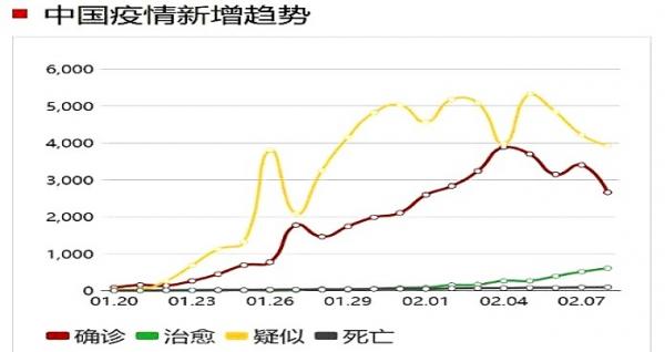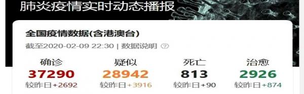 拐点到了吗?再谈钟南山是否可信 文:格致夫 据中国官方公布,截至2月9日晚22:30,全国确诊的新冠肺炎日增病患2692人,累积37290人;疑似病例日增3916人,累积28942人;治愈病例日增874人,累积2926人;死亡病例日增90人,累积813人。 为便于观察疫情变化趋势,下图(来自网易)给出过去20天全国新增病患变化曲线。