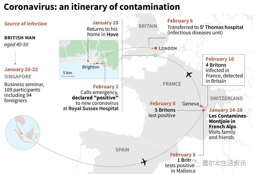 因为这名不幸在新加坡被感染的英国男子,导致其家人朋友至少11人被感染!所有同一航班的乘客都被要求医学观察;阿尔卑斯山度假小屋和附近酒吧员工被隔离;他所工作的一家英国医疗中心暂时关闭检查;英国的三所小学百余人作为密切接触者被检测……
