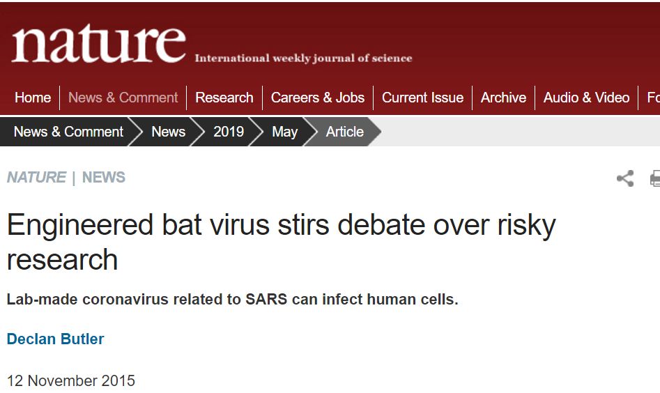 1月26日,中科院之声对传言辟谣称:2018年4月5日《自然》发表的文章研究的是【猪急性腹泻综合征冠状病毒】,简称SADS病毒,与此次发现的导致肺炎的新冠病毒并非同一种,作者是石正丽和她的同事周鹏。 他们在采访中透露了这样的信息:SADS属于冠状病毒,我们发现在同一只菊头蝠中同时携带了SARS样冠状病毒和这次猪病的病毒。"冠状病毒重组很厉害,就像搭积木一样,我的模块放在你那里,你的模块放在我这里,说不定将来重组成什么。” 一波未平一波又起。不久之后,石正丽的又一篇论文被扒出。 2015年,石正丽团队在国际著名期刊《naturemedicine(自然医学)》发表了一篇论文,名为《一个类似SARS的蝙蝠冠状病毒群显示了人类出现的可能性》。 这篇论文大致内容如此:只要把蝙蝠身上的S蛋白里的ACE2这个受体开关一调,这个病毒马上就可以传染给人类。利用病毒基因重组技术将蝙蝠的S蛋白和小老鼠的Sars病毒重组,得到的新病毒可以和人体的血管紧张素转化酶2(ACE2)结合,能很有效地感染人类的呼吸道细胞,毒性巨大。他们发现新病毒明显地损害了老鼠的肺部,所有疫苗失去作用。石正丽团队继续用猴子做实验,模拟病毒在人体上的效果。