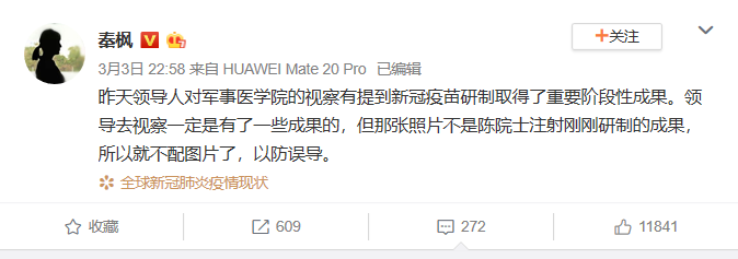 昨晚朋友圈都在瘋傳一組振奮人心的圖片,說是解放軍醫學科學院研發出了全世界第一支新冠病毒疫苗,並注射到發明人陳薇院士左臂。然而很遺憾,這張圖里給陳薇院士注射的並不是新冠疫苗。各路英雄正在努力攻關的新冠疫苗目前還遠沒有到達開展臨床試驗的程度。