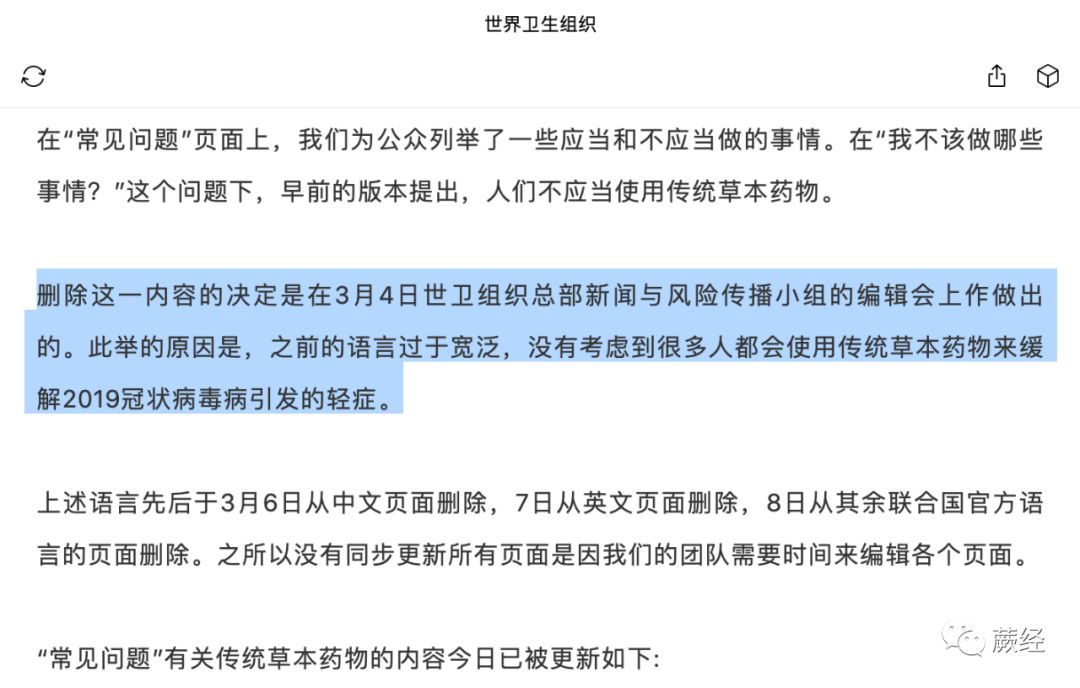 再度被WHO姗姗来迟的解释和拧巴震惊真的有点不太要脸了。『此举的原因是,之前的语言过于宽泛,没有考虑到很多人都会使用传统草本药物来缓解2019冠状病毒病引发的轻症。』这么短的一行字我来回读了好几遍,不太相信自己的眼睛。 我不是说你不可以为其他疗法辩护、我是觉得你是全世界最重要的国际公卫机构,你决定删还是不删竟然不是从科学医学证据数据出发,而是因为看到很多人都在用,所以你就删掉了,意思是法不责众?那接下来如果另一个平行时空里有很多人喜欢吃屎来缓解轻症的话,你是否也会把反对吃屎这一条删掉?难道不应该是正因为无数人都在做一件并不合理的事情,你才更加应该指出问题,明确提供做或者不做的建议,取得最佳公卫意识提升效果?你现在这样的骚操作,就算支持草药疗法者、若头脑逻辑理性清晰的话,也会觉得哪里不对——更多的人还在吸烟来缓解自己对于新冠肺炎的恐惧和苦闷,那是否也应该一并将『请不要吸烟』这一条删掉呢?你为什么不大大方方说出将『不建议草药疗法』这一条删掉背后的原因:这个领域有了哪些进展、取得了什么效果,这样全世界人民都能在即将蔓延全球的全新疫情中提早准备,一起来享受草药疗法带给新冠肺炎症状缓解或治疗的美好价值? 其次,既然全世界都在使用各国的各自的各种的传统草药疗法,那为什么要从中文开始删而不是从范围远远大于中文的英语开始? 而且,无论如何作为官方,写在白纸黑字上的内容重大变更,连一个感谢指出或者不好意思让大家困扰了对不起之类的话都没有。如此不体面、高高在上的官僚腔调实在是匪夷所思。 我是真的服气了这次:WHO the hell are you啊? WHO的官网和官推我已经看了很多年。2014年西非埃博拉那一段时期更是天天主动去刷去了解最新疫情进展情况。但这次我很明显地感觉到WHO的说话方式、叙述措辞风格等方面有一种难以名状的违和感。 深夜里看到的上面这段尤其明显。意思明明已经很明确了,就是要为宣布全球pandemic(全球疫情期)作好铺垫了,却还是各种文字游戏绕来绕去含糊其辞不知所云。WHO作为世界级公卫机构,很多措辞应该平稳周到政治正确这点完全可以理解也一直不反对,但拧巴成这样已经完全超出合理界限—— 『这个病毒既然已经在多国站稳脚跟了,所以pandemic的前景已经很迫近......但这应该是人类历史上第一个可控的pandemic......底线是:我们是不会任由病毒摆布的......』。 这些话貌似是引用,引用的是WHO总干事谭德赛主席的话。 我真的有点忍不住要骂了:都这个时候了还这样说话,这特么是有病吧? 再度被WHO姗姗来迟的解释和拧巴震惊。 |