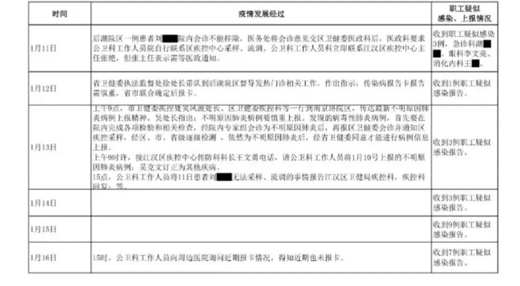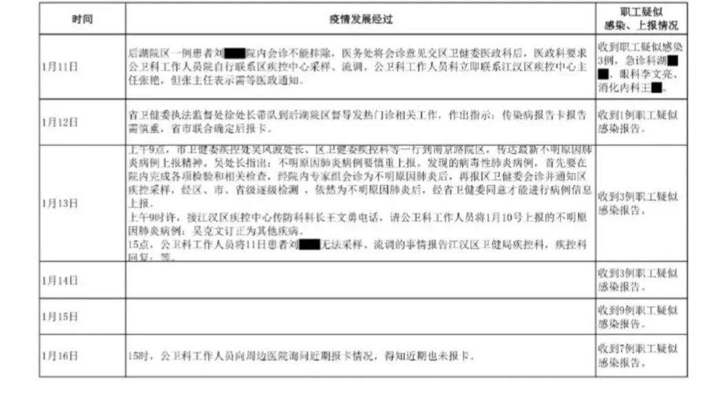 1月13日上午,武汉市卫健委疾控处处长一行再次来到医院,指示:要慎重上报……要经区、市、省级逐级检测,才能进行病例信息上报。
