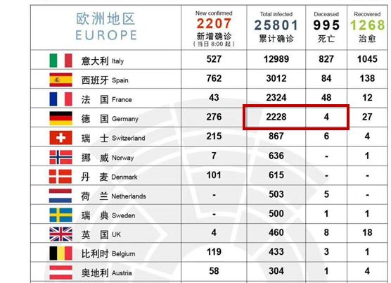 3月10号,星期二,早晨 7:00 德国首次出现两例死亡。 新闻里已经公布了德国出现了两个死亡病例,两位都是老人,患有慢性病。