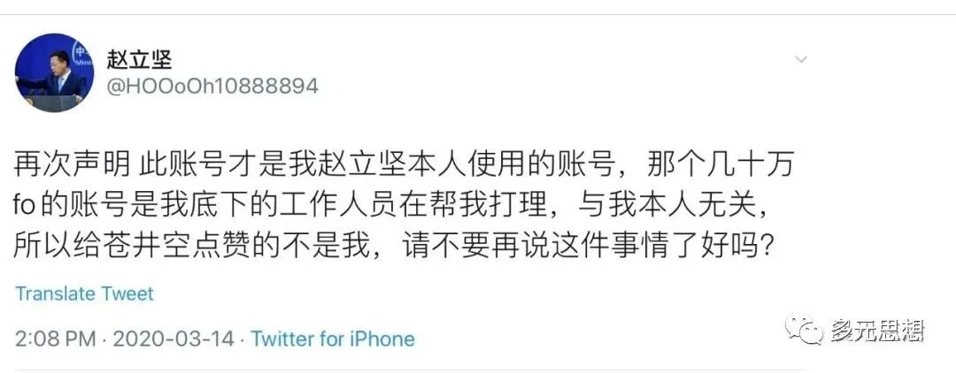 小赵同志,不要事不嫌大啊。有点名气的名人真要小心谨慎,这网络世界像个万花筒,更像个显微镜,你只要在网上有言行,就要小心被鬼精鬼精的网友把你的底裤扒个干净,这不,咱们新的发言人小赵同志刚上任不久,他的TT号就被不少网友注意到了;而且,更让人大跌眼镜的是有一个特别细心的网友竟然还去游览他在TT上关注些什么人,而且,他竟然还从仓老师的TT上发现小赵同志还是日本名人仓老师的“粉”,并立即截屏发上网当个笑话说个大家听。。。。。。 这本来是没什么的!名人嘛,被大众羡慕崇拜正常,被大众调侃戏弄更正常;再说,谁也不是不食人间烟火的圣人,男人喜欢美女本来就是很正常滴,像娶了美女还说自己是“脸盲”,就不正常!再看人家川普老头儿,一脸色迷迷的长相,一生娶了三次美女老婆,连上小学时曾强行亲吻女同学的丑事都给媒体扒出来嘲弄,不也没有影响他当总统? 小赵同志太年轻,可能觉得这事有点丢人,或者说影响自己的形象和名声,竟然为此等小事又发TT去澄清: 这个,这个,就有点那个了! 本来那个家伙报个名人的料,也就是博大家一笑,笑完就算了,你这再发TT,就是泼墨画煤--》越描越黑! 第一、大家就会知道,你竟然有两个TT号,这个美帝的社交软件普通人是用不了的,就算有本事的能弄一个号,也不敢用,这个这个为什么,我也不敢说了!你有两个号,其中有个号还有几十万“粉”,还有专人帮你打理,这如果是工作需要,那也是个不小的秘密,你,你,你这不叫泄密? 第二、据说在中国擅自使用美帝的这个社交软件还是“违法”滴,你如果解释是“工作需要”,有些人可能就会这样思考:哦,原来“工作需要”就可以“违法”,这个法律漏洞就太大太大啦!呵呵,“工作需要”还能再干些啥?真的不敢往下想啦。。。。。。