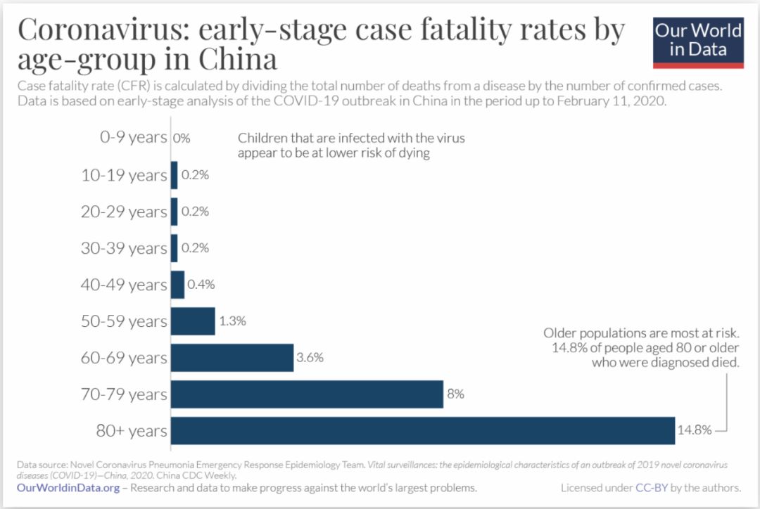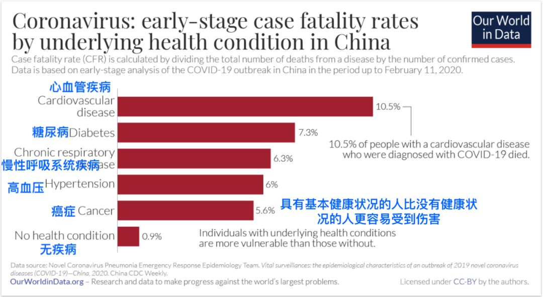 每个人都有不同的风险感知,我个人认为高于0.5%的病死率已经算是非常危险的了。上图可以看到小于40岁的风险极低在0.2%,到了40-50岁风险就翻了几倍接近1%,60-70岁的风险就在3.6-8%,而80岁以上的风险最高在14.8%。年龄是一方面,下图我们再来看看还有什么健康状况会提高风险。