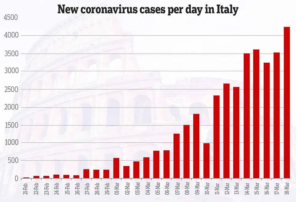 今天的意大利,惨烈,震惊世界。 每半小时下葬一人,成批的医护人员倒下。现实版“死神来了”正在上演。 据意大利民防局周五晚间公布, 意大利周五新冠病毒肺炎死亡病例新增627例, 增幅达18.4%,累计死亡病例4032例。 这是疫情爆发以来死亡人数最多的一天。 周四开始, 意大利新冠病毒肺炎死亡人数已经超过中国。 而意大利新增确诊病例, 24小时增长近6000例,上升幅度大约14%。 贝加莫,这座仅有12万人口的小城, 目前已确诊超4350例。 当地医疗官哽咽得语不成句: “在贝加莫,每人都有一个亲戚或朋友离世。”