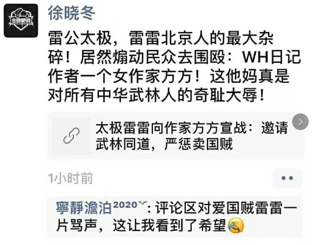 我号召在武汉的武林同道,趁着武汉还在封城,方方没有离开武汉,那么,你们应该去声讨这个方方!请你们拿出你们正义的拳头,去惩罚这个中国人的罪人,谢谢。