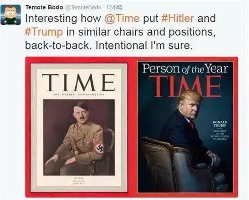 这显然不是《时代周刊》偶尔针对性的怼美国总统,怼川普了。 2017年5月,它的封面是这样的: 色彩斑斓的克里姆林宫(墙体是克宫,洋葱圆顶是俄罗斯圣巴西尔教堂)正在逐渐吞并、同化纯色的白宫。 除了这幅画,封面上再无一字,《时代周刊》葫芦里卖的什么药? 众所周知,克里姆林宫和白宫,是俄美政权的象征。有媒体分析,《时代周刊》是在批评特朗普与俄罗斯走得太近,暗讽特朗普有通俄的嫌疑。 自免职FBI原局长科米后,特朗普“通俄门”事件愈加扑朔迷离。即便如此,特朗普仍是美国国家元首、最有权力的人,《时代周刊》无凭无据,竟敢暗讽总统,实在是胆大包天! 特朗普发推特反驳“通俄”,称“这是美国历史上对政治家最大的政治迫害” 翻开历史,《时代周刊》胆子确实大的出奇。美国总统,都要被它玩坏了。 特朗普,就多次被恶搞。 ▼2016年,特朗普以共和党总统候选人的身份开始与希拉里角逐。当年的8月22日,《时代周刊》将特朗普选为封面人物,只是这画风—— 2016年8月22日《时代周刊》封面 特朗普活像一块湿哒哒、黏糊糊、正在融化的口香糖,要不是标志性的发型和更具标志性的大嘴,还真认不出来是谁。 恶搞画像就算了,旁边还写着“Meltdown”,意思是垮台! ▼ 两个月后,《时代周刊》又推出了“连续报道”,再次刊登特朗普漫画2.0版本,还是之前的配方,还是原来的味道—— 2016年10月24日《时代周刊》封面 这次,特朗普彻底融化掉了,文字也变成了“Total Meltdown”,彻底垮台! 彼时,特朗普与希拉里激战正酣,背后被《时代周刊》捅了一刀,特朗普的内心应该是崩溃的。 特朗普如果垮台了,也是《时代周刊》拆的台。 《时代周刊》猜中了开头,没猜中结尾。特朗普越挫越勇,不仅没有垮台,还完美逆袭,问鼎总统宝座。《时代周刊》也顺势服软,将特朗普选为2016年年度人物。 《时代周刊》2016年年度人物 这次封面照非常正经,特朗普端坐在豪华皮椅上,目光凝重而坚定,俨然一副成熟政治家的风范。 可惜,帅不过三秒。 马上有网友发现,特朗普坐的椅子及坐姿,与希特勒非常相似,俩人竟然还背靠背。