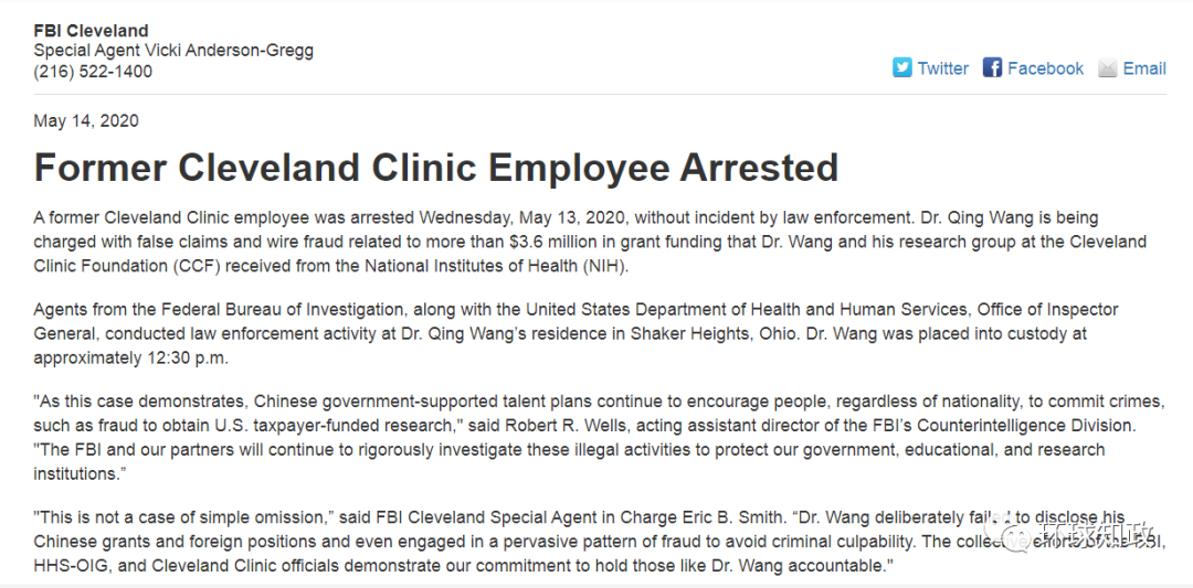 昨日,美国司法部宣布,美国克利夫兰诊所(Cleveland Clinic)前雇员王擎周三在家中被捕。他被控“电信诈骗和虚假陈述”,涉及其从美国国立卫生研究院(NIH)获得360万美元的拨款有关。刑事起诉书显示,王擎为中国政府资助的“千人计划”学者。据不完全统计,近一周,这已经是第三位著名华人科学家在美被逮捕、判刑。 据百度百科词条(2020-2-26日最后修改更新)和华科创新研究院资料显示:王擎,甘肃省定西市陇西县云田镇人,现任华中科技大学教授,长江学者,华中科技大学生命科学与技术学院院长、教育部Cardio-X"长江学者"创新团队负责人,分子生物物理教育部重点实验室主任。华中科技大学人类基因组研究中心主任、美国克利夫兰临床医院心血管遗传中心主任。美国科学促进会会士。 王擎1984年毕业于甘肃农业大学农学系,于1993年获美国常春藤(Ivy League)八大名校之一的康奈尔大学(Cornell University,美国纽约)遗传学和发育生物学专业博士。1991年考入中国农业科学院研究生院,两年后赴美学习,在康乃尔大学获博士学位。在美国克利夫兰州立大学从助理教授做到正教授,2001年任克利夫兰临床医院心血管遗传中心主任。王擎主要研究冠心病、脑卒中、心率失常、房颤、先心病、高血压、肺动脉高压等疾病的遗传与分子机制、精准诊断与治疗等。已发现14个人类疾病基因,共发表学术论文210多篇,包括2篇Cell、3篇Nature、2篇Science和5篇Nat Genet,单篇被引用超1000次论文3篇。近5年发表论文61篇,包括Nature, Nature Genetics, American Journal of Human Genetics, PLoS Genetics, Blood, PLoS Biology, Human Molecular Genetics, Stroke 等高水平论文。在研项目包括2项973可以,2项国家基金委重点项目,1项国家基金委重大研究计划培育项目,1项湖北省自然基金重点项目,1项湖北省医学领军人才项目,和2项和国际500强制药公司合作项目。网址:http://ii.hust.edu.cn/info/1008/1336.htm#