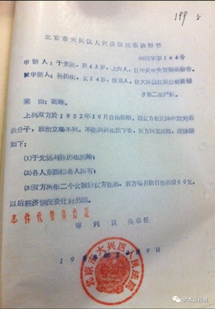 2013年,于光远以98岁高寿辞尘,于小红料理完后事,就迫不及待解开一个谜:父母到底怎么离的婚? 关于这件事,父亲、母亲、姥姥、姨妈、继父,每个人都有一套说辞。从少女时期,于小红就好奇,为什么一桩离婚案,众说纷纭,而那时,他们本没有离婚条件。 新中国第一部法律就是《婚姻法》,出于保护妇女儿童权益的考虑,《婚姻法》明确规定,孕期及哺乳期妇女,不能判决离婚,且离婚案件必须经过调解阶段。 在托了很多朋友,打过100多个电话后,于小红接到北京法院档案室的通知,她父母的离婚证原件找到了。 那张已脆弱到一碰即碎的纸,实际是调解书,而最后一句:本件代替离婚证。无厘头地解体了一桩才子佳人的美满姻缘。 于小红几十年执着于此,为的是给三妹争一个公道。 父母离婚时,孙历生已临盆在即,不久,他们的三女儿于小蓓出生,这个孩子的身份成了麻烦。离婚后产子,于小蓓从落地就背负了私生女的名声,于光远对外则否认有这个女儿。 一年后,孙历生和农场的另一个右派组成了新家,于光远几年后也再娶,于小红和妹妹就在两个家庭中徘徊成长。 1968年7月12日,三妹小蓓正在姥姥家的院子里铲土玩,几个女三中的人急忙忙进来,年幼的她有第六感觉:妈妈不在了。 孙历生的死因结论是自杀,但自始至终家人都无法接受这个说法,于小红姐妹坚信母亲是被害死后挂上窗棂的。 多年以后,老迈的于光远告诉女儿,母亲死前半个月他们见过面。当时,刮起清理阶级队伍的风潮,那次见面,于光远预感到孙历生在劫难逃。 倔强,是孙历生的性格,这一点也遗传给了女儿。70年代初,在塞外农场,于小红曾向父亲滔滔不绝讲着信仰的价值,与当时主流不同调的言论从她口中喷薄而出,父亲听罢落泪,指着她:你妈妈她就是太...... 文革前,家庭的破裂并没有影响于小红接受最好的教育。1960年景山学校成立,于小红是第一批学生。 这所从小学到高中的一贯制学校至今仍令人仰视,当时招生的范围主要是高级干部子女,即今天所说的红二代,少量招收校区附近的平民子弟。于小红的同学中有后来的南开大学校长龚克,著名演员李成儒。 景山学校实行的是超纲教育,相比其它学校,这里学习的内容超前且艰深。自己的子弟学校,就是要培养明日接班人,红色祖国的精英。 于小红后创建科技公司,源于小时候对物理课的爱好,那个姓邹的老师给了她难忘的启蒙。 多少年后,景山学校同学聚会,邹老师已垂垂老矣,于小红仍然感谢她当年给予的小小鼓励,欣赏的眼神。 邹老师一把拽住于小红,说出了几十年的秘密。她也毕业于女三中,孙历生是她入党介绍人,过去怕沾惹麻烦,一直闭口不言。“你妈妈对我的好,我只能回报在你身上。” 于小红不禁想起姥姥爱说的一句话:人心换人心,八两对半斤。 ④ 1969年初,于小红到陕北插队落户。那批去陕西插队的北京知青,50年后改变了中国命运。 与母亲一样,于小红走到哪都是一道夺目的风景,即便在爱情受压抑的时代,于小红身边仍不乏各色爱慕者。 70年代的西安城有一个说法,追过于小红的人,有一个加强连。(关于西京故事,可读之前讲读书会一文)山河表里潼关路 于光远文革时被下放到宁夏劳动,于小红长途跋涉去帮父亲料理生活,父亲给她补习功课。随着于光远处境缓解,于小红也获得了上大学的机会,进入西安交大学习电机。 当时的西安地下读书会,极力争取于小红加入,但她敬谢不敏,至今仍有她是其中一员的讹传。 虽然没有加入那个群体,但于小红和读书会也非毫无渊源。读书会成员,同为交大学生的张守明是于小红彼时男友。 在交大流传着一个段子,那时于小红的爱慕者想尽办法接近她,凡她借过的书,追求者都要借来一读,以期找到共同语言。于小红顽皮的性格颇爱恶搞,她于是专门借些晦涩难懂的书,读得一众登徒子眼花头大。 近来年,关于于小红婚恋的传说林林总总,但无一靠谱,都是杜撰讹传。比如说她前夫叫刘世定,就是一顶张冠李戴。 刘世定是川康省主席、起义将领刘文辉的孙子,北京四中学生,与刘源同班,并一同在雁北山阴县插队,后考入于光远门下,执教燕园。 于小红的前夫确实是父亲的门生,但不是刘世定,而是刘世定的师兄兼同事,曾任北大社会学系主任的马戎。 她和马戎有一个女儿,随着于小红去国深造,这段本就爱得不够深刻的婚姻产生了危机。虽然一家三口曾在美国短暂团聚,但于小红事业上升后,这段婚姻还是亮起了红灯。 于小红的第二段婚姻,丈夫是来自台湾的物理学博士,因之前工作于美国战略核心部门,对政审有严格要求。于小红的家庭背景,让美国人不敢相信一个红色高官的女婿,婚后便赋闲在家,成了于小红的贤内助。 于小红性格爽朗、达观,是她招人喜欢的主要原因,哪怕生活充满苦涩,她也会笑对,即便是人生重大转折,在她处理也是游戏一般。 1978年丁肇中说服了国家领导向外派遣留学生,由他优先挑选十几个人到实验室工作,于小红被派去做翻译。 选拔考试上,有个德裔教授顺手给了翻译于小红一份试卷,不知道为什么那天出了灵感,她很顺利答完,第一个交了卷。 过了几天,她被通知去人民大会堂等待接见,丁肇中给主管科技的方毅副总理写信点名要于小红去工作,因为她考了第一。 到了德国,遇到丁肇中口试,不会的题她也马上回答,丁教授出题越快,于小红答的也越快。突然,丁肇中停下来问她:“你回答的