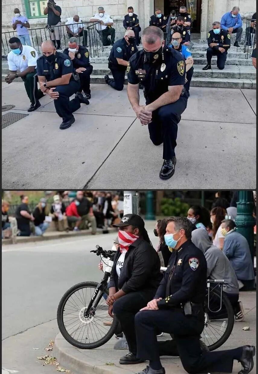另一方让你看到的是警察与民众和解,小清新跪祈爱与慈悲: