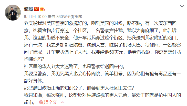 我真的很吃惊,我本来以为我已经不吃惊国内有一帮种族主义的网民了。在美国待了多年。这回我其实也蛮惊讶地看到很多警察,包括纽约警局局长跟黑人共同跪地,共同表达对种族主义的抗议。但真是没想到,连美国警察(当然,是部分)都不认同的东西,居然在国内被大学教授堂而皇之不知羞耻地说出来。