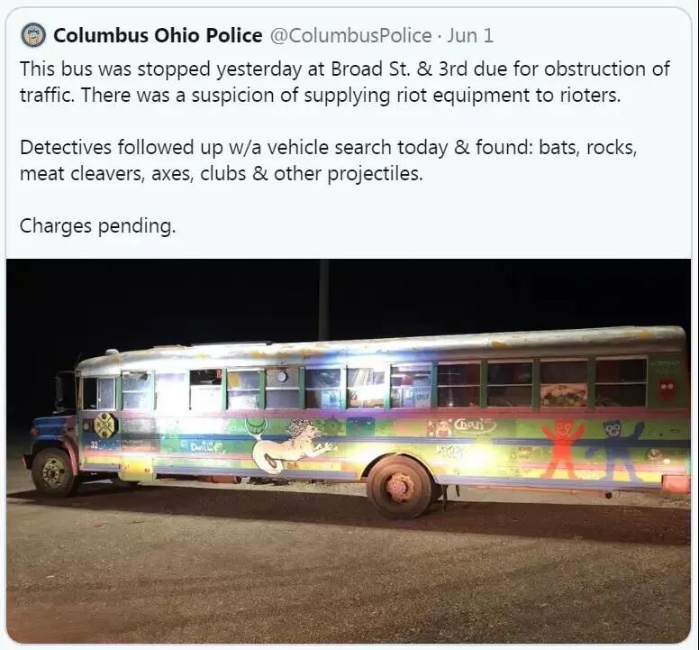 警方在骚乱现场,截获运送暴徒的大巴