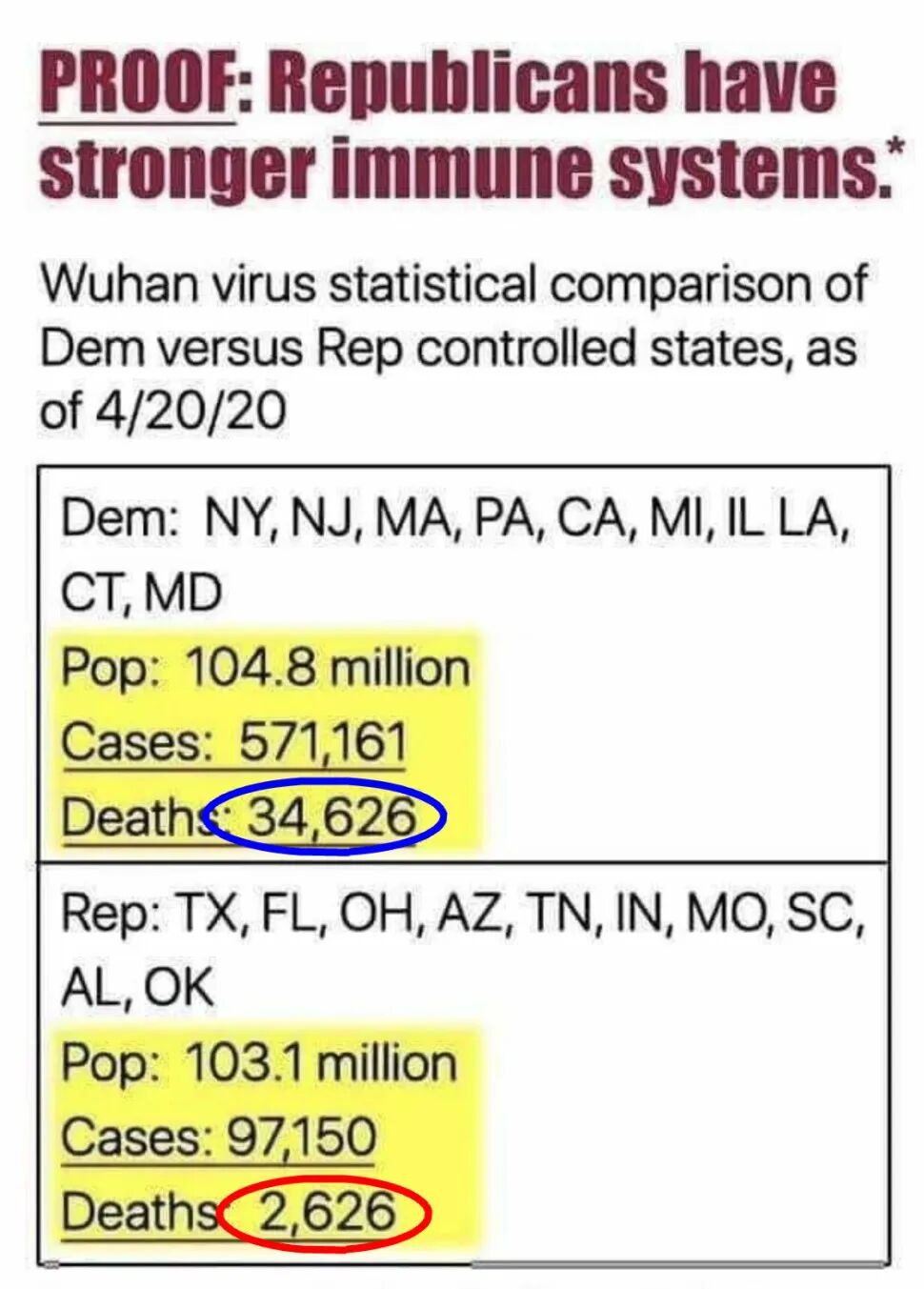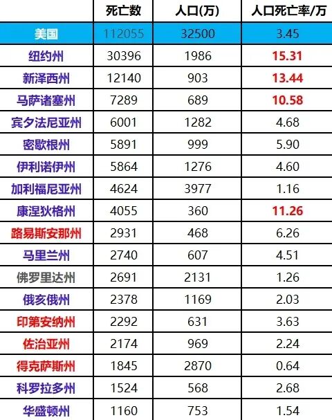 十个蓝州1亿人,死34626人;十个红州1亿人,死2626人。难道,这病毒是定向攻击蓝州? 四个蓝州5100万人,死43679人;四个红州7200万人,死6987人。最离谱的,当然是纽约州了。 死亡率超过千分之一的都是蓝州,纽约州的死亡率更是引领全美。同样的新冠病毒,在红州蓝州导致的死亡差异如此之大。《纽约时报》怎么只顾煽情,不深挖一下原因? 举几个曝光的事情。纽约州强制养老院接收感染的新冠病人,造成养老院高龄人士的大量死亡。纽约州把感染的新冠病人送到医疗船,那里本来是计划收容医院的普通病人给新冠病人腾出床位的。华盛顿州承认把枪击死亡的感染者也纳入新冠死亡统计...... 有人说,加州也是深蓝州,这次不是做得挺好吗?大瓜来了,加州Riverside郡警长爆出,加州州长Newsom每天从墨西哥用直升飞机运进20个新冠病人,把他们送到不同的医院。懒得举例了,相信后面会有越多越多的蹊跷事情被曝光。