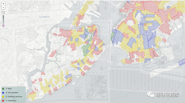 纽约五个行政区的红线政策。来自NPR的“MappingInequality”的屏幕截图。