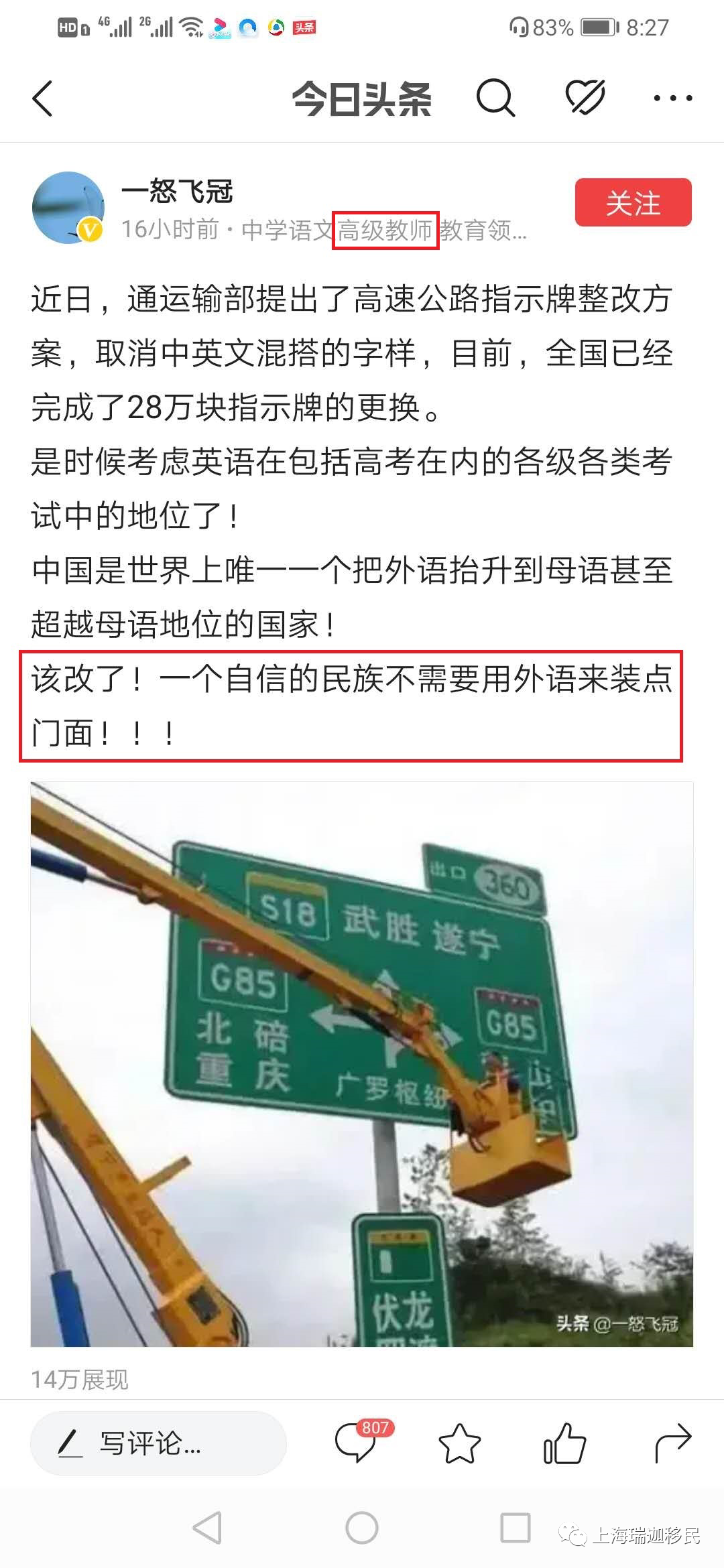 七、这样花纳税人的钱,值吗? 全中国的高速公路总里程14万公里,各种指示牌数以百万计,全部更换的总费用需要几十亿。今年我国是多灾多难的一年,先是疫情;警报尚未解除,各地又遭水灾;企业无法持续经营,甚至破产;民营企业裁员致失业率猛增;6亿人仅靠月入一千度日……国家、企业、国民都在艰难中前行。此时的钱,应该用在救国、救灾、救企业、救人民上,更换路牌不是当下的必须。 八、这样的老师能教出拥有国际化眼光与宽容胸怀的学生吗? 今天的学生,将来要面对的是国际化竞争。老师的职责不止是为学生答疑解惑,更是要拓宽学生的视野,培养能够适应国际化竞争的人才,老师的言行将潜移默化影响他门下的每一个学生。这位“高级教师”自己的眼界已经把外语的功能仅定义为“装点门面”,试问: 1.他的学生不学习英语,他是支持还是反对呢? 2.如果他是校长,是不是要取消英语课? 3.他的学生长大成人后,是不是不准备踏出国门一步? 疫情至今,战狼四起,夜郎自大的“爱国者”比比皆是。他们是不是都是这类老师的门徒?井底之蛙的老师,只能教育出战狼,培养不出鸿鹄之志的国之栋梁!