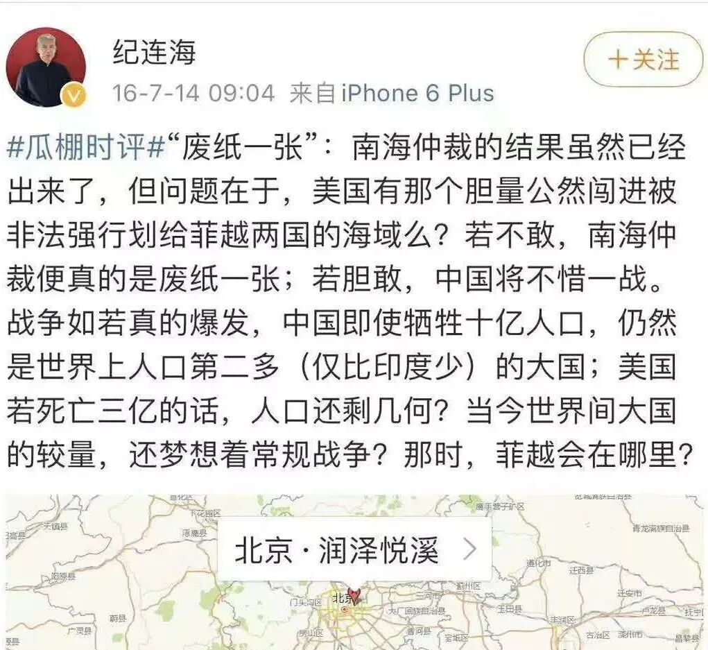 1 以上这个“著名帖子”流毒甚广,被很多“爱国者”广为引用。 这个用说书方式胡诌历史的纪连海,竟然用这样的思维来运用他的逻辑:“战争如若真的爆发,中国即使牺牲十亿人口,仍然是世界上人口第二多(仅比印度少)的大国;美国若死亡三亿的话,人口还剩几何?” 不过这个狂妄之徒紧接著又自打嘴巴:“当今世界间大国的较量,还梦想著常规战争? 既然你知道大国间的较量不可能是常规战争,又如何推理出“牺牲十亿”和“死亡三亿”的比率? 你以为双方是玩“丢核弹游戏”吗?俺国的人口密度大,牺牲的人就多;对方的人口密度小,死亡的人也相对少。 反正咱人口基数大,十个换三个,划得来! 真想给你扇100个大嘴巴子! 人类的生命在你的心里和嘴里,就是这样一串冰冷的数字? 十亿人口,就这样被你灰飞烟灭地抹掉了。这其中包不包括你?包不包括你的爱人亲人家人? 要不“让你们一家先走”?你先做个表率,用你家的十条人命去换老美的三条人命,以示“坚决爱国”? 你这井底之蛙压根儿不懂,现代战争,已经发展到以“斩首行动”为优先考虑的资讯化战争。 擒贼先擒王,古法有之,演变到现代版,就是精准的斩首行动,一架无人机足矣。 甭以为“战场”还是呜泱呜泱的人海战术,“战绩”也不是以死多少“敌人”为衡量标准。 一个伊朗二号人物的灭亡,足抵一个旅一个师,甚至从根本上动摇一个国家的根基。谁来跟你比“死人多少”?有意义吗? 姓纪的那厮还胡诌道:“那时,菲越会在哪裡?”这是说,中国准备用核弹摧毁菲越两国? 这又是反人类思维的狂妄之言。在他的世界裡,人民只是政治家手中的炮灰,随时可以作为无谓的代价。