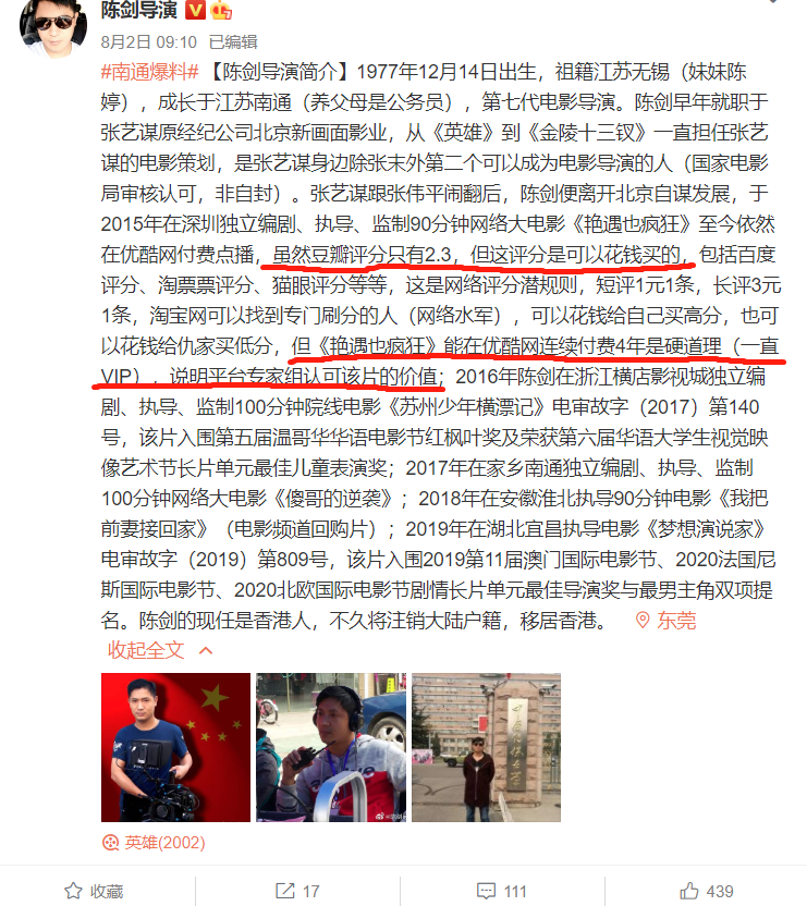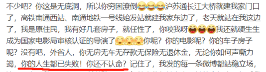 陈剑导演还说,自己懂政治,呵呵,从你嘲讽张玉环的言论来说,我还真看不出你懂啥,你连人性和人生都不懂,其他还能懂个球呢?陈剑导演还嘲笑别人“你的人生都已失败”,不知道哪里来的自信,你难道成了上帝,拥有评判别人是否成功的资格了?