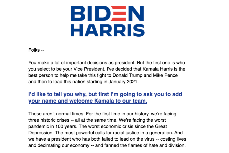 拜登在推特上寫道,我非常榮幸地宣布,“我已經選擇卡瑪拉·哈里斯(Kamala Harris)作為競選搭檔,她是一個無畏的戰鬥者、美國最好的公僕之一”。