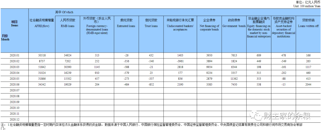 2020年1-6月份,中国社会融资增量数据为20.84万亿元,这就意味着实体经济从金融体系中得到新的信用(货币)总额为20.84万亿元,其中: 人民币贷款:12.33万亿元; 外币贷款(折人民币):3481亿元; 委托贷款:-2306亿元; 信托贷款:-1295亿元; 未贴现银行承兑汇票:3863亿元; 企业债券:3.337万亿元; 政府债券:3.795万亿元; 非金融企业股票融资:2462亿元; 存款类金融机构资产支持证券:-537亿元; 贷款核销:4463亿元。