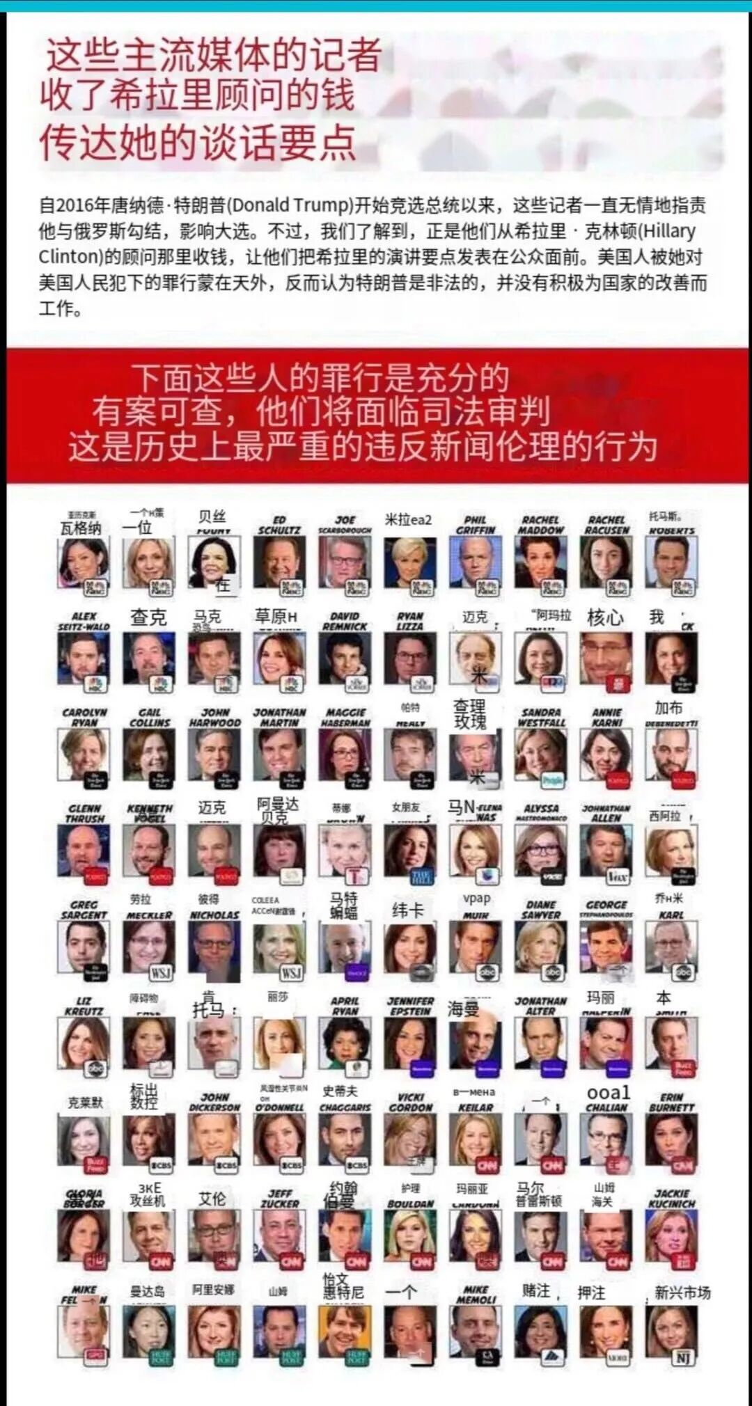 另外,网络媒体还爆料了一张图片,上有90个主流媒体记者的名字和头像,指明这些人都是有据可查地拿了希拉里的钱来抹黑特朗普的。