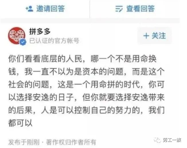 这两天拼多多女员工猝死的新闻上了热搜!员工因为工作劳累猝死的新闻时常会有报道,但都没有引起多大轰动!这一次却因为拼多多一条无情的回复引发众怒,而引发了热议!声讨的文章和评论也是很多! 如今老百姓真是生容易,活容易,但连一起,生活就不容易了!中国年轻人面临着新中国成立以来最大的生活压力和工作强度,工作时长也是世界之最,也是新中国有史以来之最!他们面临的问题比上几代人都复杂,他们面临的资本压迫超过了前几代人之和! 在旧社会由于工人阶级较少,所以面临阶级压迫的人群相对没那么多,可如今中国城镇人口早已超过了农业人口,就是农村人口大多也出来打工了,农村只剩下了一些老弱病残。大量新产业工人——打工人的涌现,让资本能压榨到更多的人,获取更多的利润,榨取更多地剩余价值!中国长期实行的廉价劳动力政策,也为资本剥削打工人提供了便利! 拼多多22岁女员工在大好的青春年华猝死,不得不令人扼腕叹息!这就是我们90后、00后所面临的工作环境和社会环境,恶劣到了令人发指的地步。资本通过掌握的舆论主导权,对他们洗脑,猛灌心灵鸡汤,说什么资本家能有今天都是努力奋斗的结果,把加班文化包装成奋斗文化!画了个大饼给年轻人,然后让你不懈努力,方便他们榨取更多剩余价值,最后换取了他们在富豪榜上的排名! 拼多多老板黄峥就是如此!拼多多的迅速崛起,只用了短短三年的时间,就超过了发展十多年的京东成为行业老二,黄峥更是在2020年打败马云成为富豪榜的第二位,他用短短三五年的时间走过了别人十来年达成的成就!所以他财富的积累更是建立在更加残酷的压榨员工的基础之上,他们的员工常常一个人干几个人的活,在高强度高节奏长时间的像机器一样的劳作! 现在的很多企业确实不把员工当人看,就是当机器使用,他们把泰勒的科学管理发挥到了极致,把人训练成了呆板的机器,以获得更大的价值!泰勒的科学管理早已受到马克思主义者的批判,现在却成为中国企业的圭臬!还有中国企业提倡的狼文化,其实就是没有人性的丛林文化,与现在提倡的以人为本的现代企业文化发展潮流相悖,是时代的大倒退,是逆发展潮流的!拼多多显然是这类企业的突出代表!