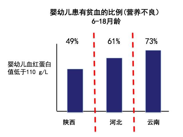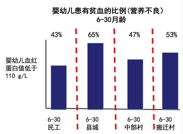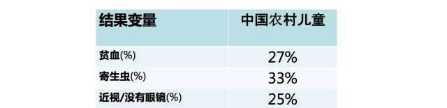 这个是今天的中国农村。 27%的学生贫血。33%——3个学生里面就有1个,肚子里面有虫子。最后,还有25%的学生是看不到黑板的。你想一想,他怎么能学? 这个问题其实非常好解决,天天他们都集中在一起,非常好筛查,发眼镜,发驱虫药。我们的团队是做行动研究的。我们会选100个学校,50个学校发维生素,50个学校不发。一年回来就看看成绩的变化,有很大的变化。发眼镜也会有变化,这是当然的结果——如果你看不见,我给你眼镜,你的成绩会提高。 所以是不是小学没学好?yes,这个答案是非常明显的。