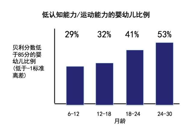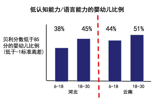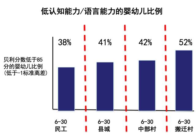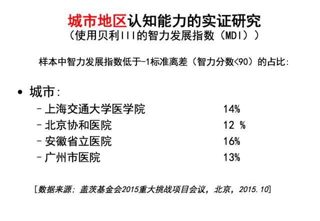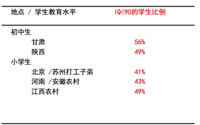 上帝就是这么安排的,有些人的智力发展就是比另外一些人低。 那农村呢?农村是怎么样的?你去查查看,我给你我的斯坦福账号,能在全世界的网络资源库里查——没有一个团队测过0到3岁农村孩子的认知水平——一直到我们的团队,我的同事开始做。 这个怎么测?其实很辛苦,他们要差不多3个小时去测他的IQ。你测到一个小时以后,那个宝宝就困了,要拉屎了,要换尿布了,睡觉了,非常辛苦。这是在全世界,从1967年来时用过一千万次,ten million times的一个IQ测试,是比较准确的。 我们做得怎么样?我们第一步是在陕南,从山区的农村随机抽样的1800个婴儿,每6个月我们测一次。24到30个月,已经超过1000天,超过一半的宝宝发展缓慢。 也就是说,一半的农村宝宝一辈子没有一个很好的IQ能够去用于学习。 后来我们又在在河北跟云南做了这个测试,得出来的数据是45%和51%。 或许你说,那是山区。那么下面这个是浦东的农民、民工,北京的民工,郑州、西安的民工。这个是县城的农村。这个是中部大村——河南、安徽。这是搬迁村,反正到处都是40%,50%,一半。 你想这个是不是一辈子的问题? 这个是甘肃跟陕西的初中生,我们给他们另外一个测试,一半的学生是发展慢的。还有小学生——北京郊外,苏州打工子弟学校的学生,河南、安徽、江西——也是一半。 因为你要是3岁IQ慢,你就是到最后IQ慢——几乎一半三岁的小孩生在中国农村,所以是几乎一半的一半,几乎是1/3的中国未来劳动力,IQ是低的。